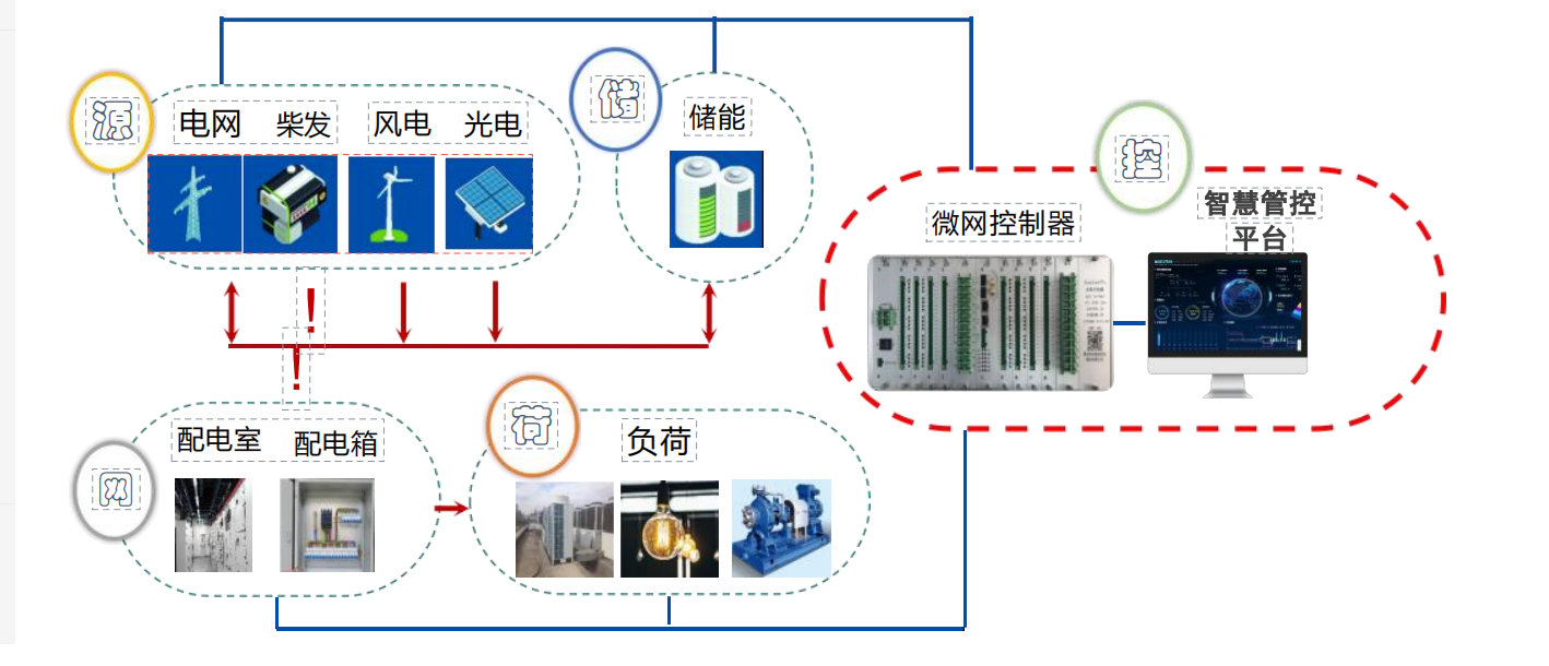 智能微電網(wǎng):由源(分布式電源)、網(wǎng)(配電網(wǎng)絡(luò))、荷(負(fù)荷)、儲(chǔ)能及控制系統(tǒng)構(gòu)成的小型電力系統(tǒng),能夠?qū)崿F(xiàn)自我控制、保護(hù)和管理的自治電力系統(tǒng),既可以與外部電網(wǎng)并網(wǎng)運(yùn)行,也可以孤網(wǎng)運(yùn)行。